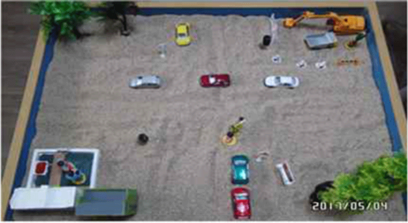 손가락으로 4개의 구역을 만들고. 신호등과 표지판을 놓는다. “건널목에는 가족이 건너가려고 신호를 기다리고 있다. 도로에는 차들이 다니고, 아이를 낳아 퇴원하는 가족이 있다(좌하). 건물을 짓는 공사를 하는 곳(우상)도 있다. 내담자는 밤에 잘 때 피곤하거나 깊은 잠에 들면 깨워도 못 일어나고 소변을 보게 된다고 말한다”.